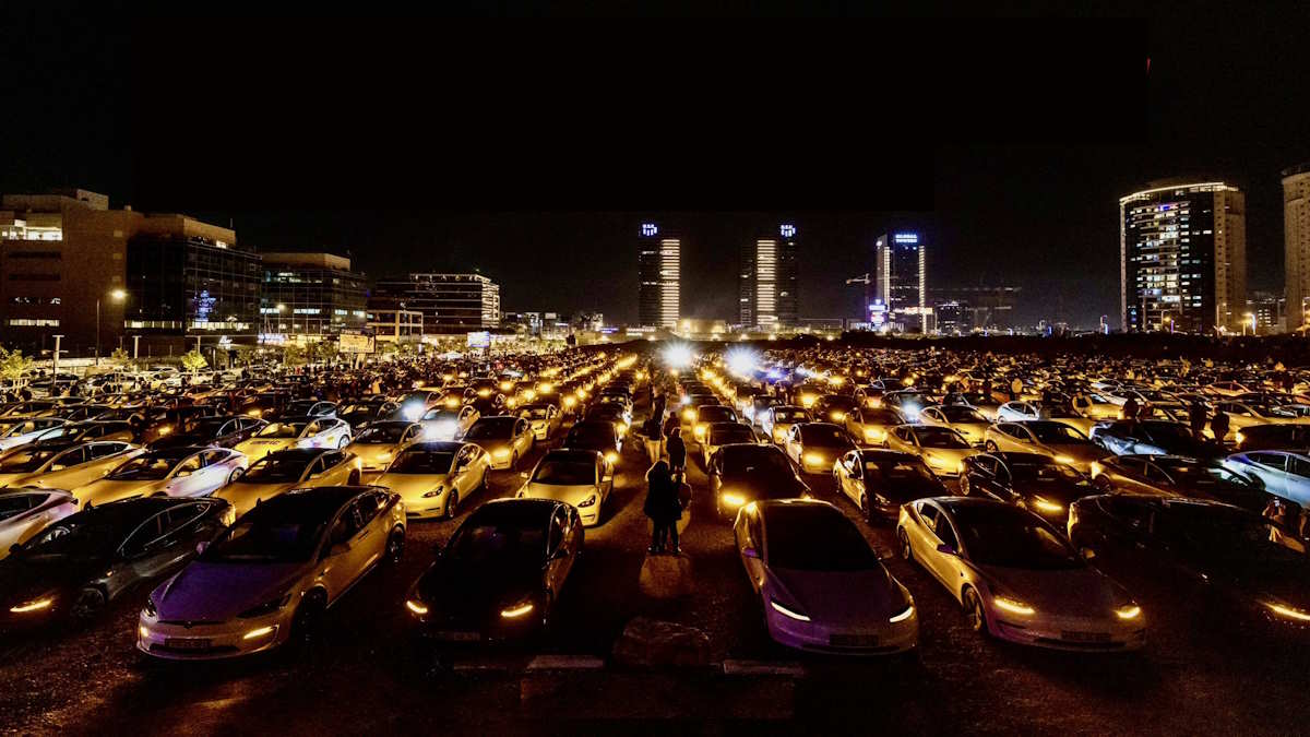 700 Israeli @Tesla drivers came together to create a first of its kind lightshow in support of the more than 100 Israeli hostages being held captive in Gaza. #BringThemHomeNow 🎗️ pic.twitter.com/EtVNXHSqGJ