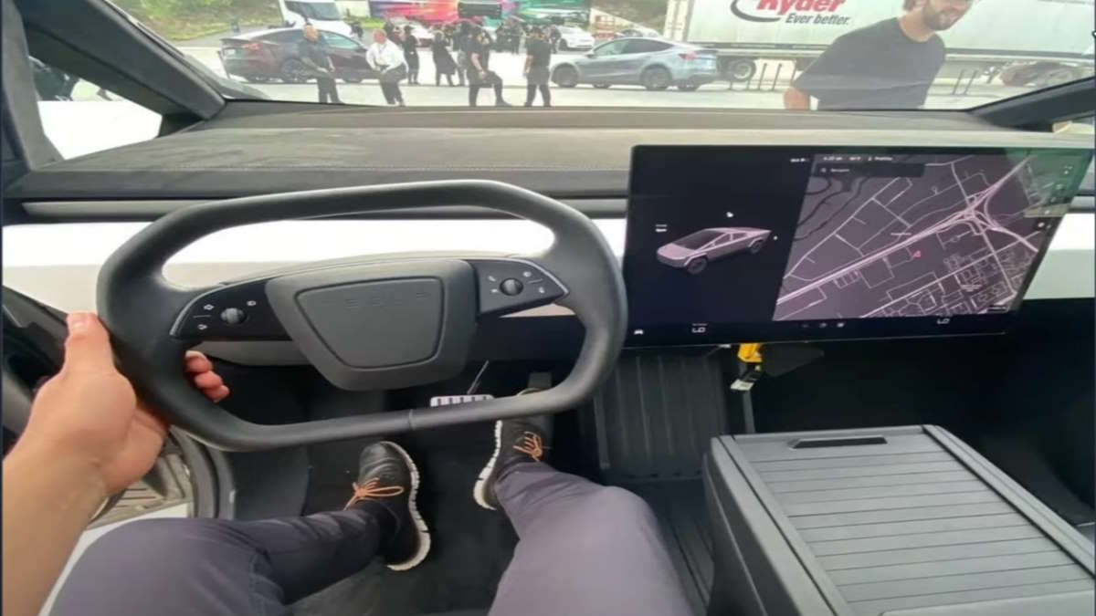 Based on the view, it looks like somewhere near Giga Texas. There is a hexagonal wheel, which is like a combination of the yoke and a steering wheel. There are no stalks for the steering wheel, either, so you'll have to use the arrows for turn signals.