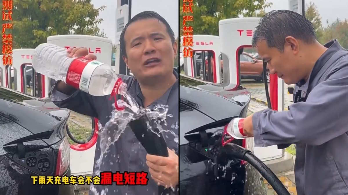 A man in China poured a large bottle of water on the head of his charging cable and then plugged it into his Tesla vehicle. After that, he poured water directly on the charging port.