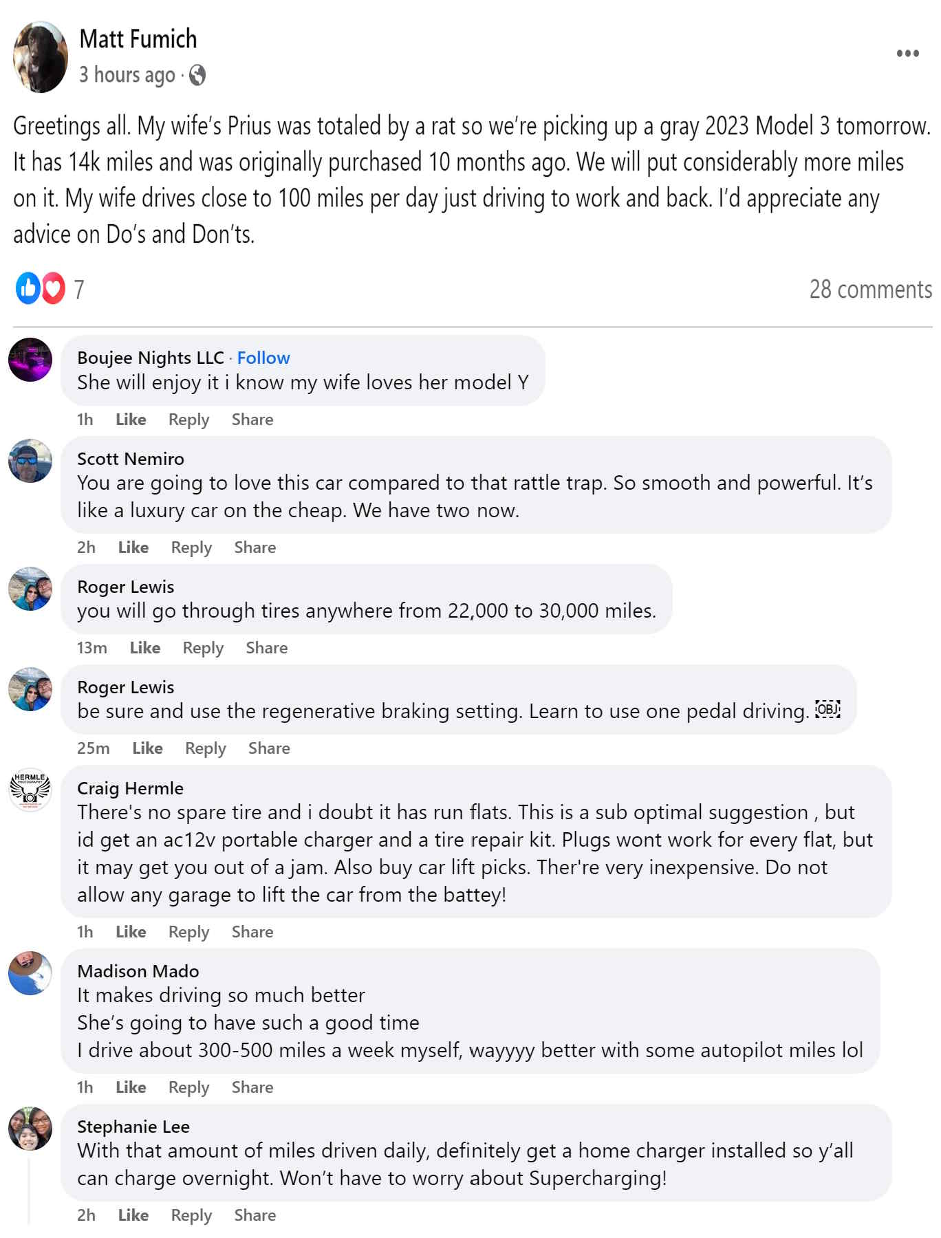 The excitement around the Fumich's new acquisition was palpable in their community. Comments ranged from Boujee Nights LLC saying the wife would enjoy it based on their own experience, to Scott Nemiro describing the Tesla as "like a luxury car on the cheap." The consensus was one of enthusiasm and support, with many offering personal anecdotes and tips to ensure Emily's transition would be smooth.