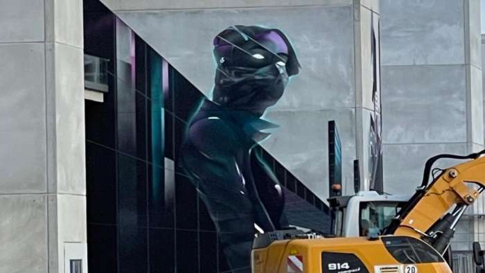 This particular art pieces sort of looks like Elon Musk dressed with a mask and waring some kind of ear phones or earrings. The masked person is leaning up against a black wall. It's anybody's guess as to what building the black wall is referring to.