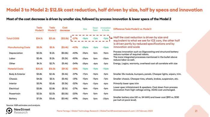 The biggest savings will come from the reduction in size of the battery for the Model 2: about $3,400.