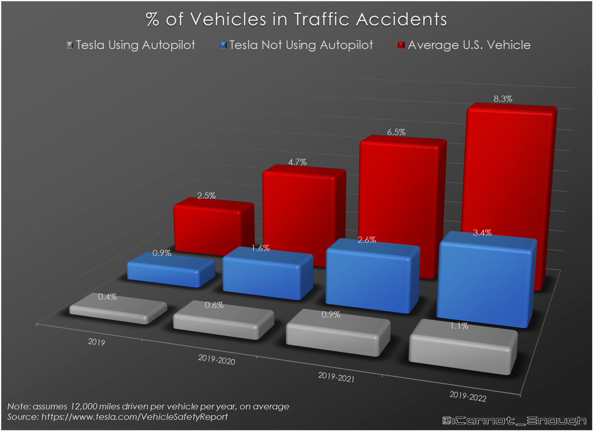 There are three rows here: a Tesla using Autopilot, a Tesla not using Autopilot, and a non-Tesla vehicle. The first row is the chance of accident when using Autopilot in a Tesla. When Autopilot is off, the data shows that an accident is more likely. It's even more likely when not in a Tesla at all.
