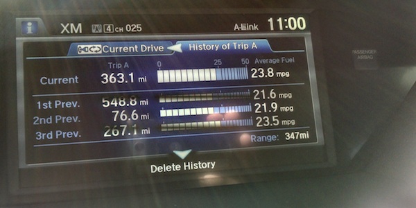 We experienced a fatigue-free driving experience with all comfort systems actuated. Individual adjustable climate control, cooled seats, navigation and stereo turned on in surround sound mode; 2015 Acura MDX recorded an average combined fuel consumption of 23.8 mpg on the return leg or our trip, with an average 22 mpg recorded for days 1-3 of our mostly city driving leg of the Phoenix MDX review. We find these results to be exceptional.