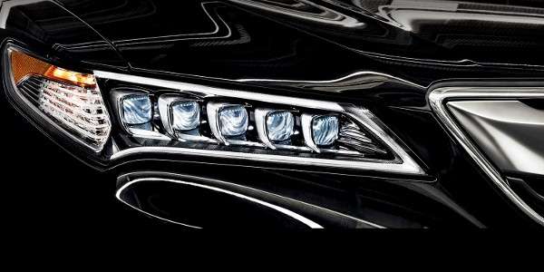 Looking to the front end of TLX, we discover a wide multiple projector-like array of LED lamps. What this very effectively does is light a wider path of blue/ white light while reaching down the road several hundred feet. In high beam, night turns into day.