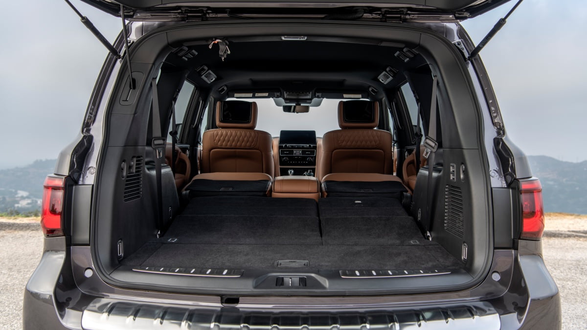 3. Cargo capacity. Infiniti QX80 offers 16.6 cubic feet of space behind the third-row seats, 49.6 cubic feet behind the second-row seats, and 95.1 cubic feet with the second and third-row seats folded down.