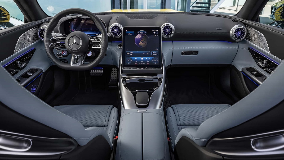 Moreover, its torque is 369 lb-ft, which is 15 lb-ft more than the SL43's. AMG designed the redesigned GT with a mild hybrid system that temporarily increases power by 14 horsepower. An automated transmission with dual clutches and nine speeds transfers output to the back axle.
