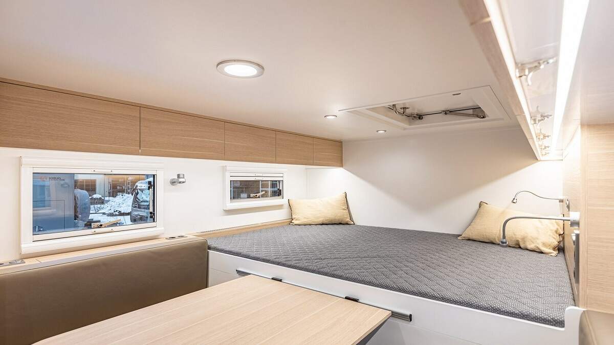 The XL 175 has one fixed double bed and two bunk beds that are 175 cm (5.74 feet) long. In addition, it has a combo bathroom, a 660-ah home battery, a Vitrifrigo Slim 150 refrigerator/freezer combo, and a Miele cooktop with two cooking zones. A 285-liter (75.2-gallon) tank is used to store grey water, and a 545-liter (143.9-gallon) water tank is also there.