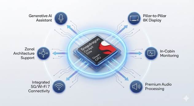 [IMAGE SUGGESTION: A graphical representation of a System-on-Chip (SoC). The center chip is labeled "Snapdragon Cockpit Elite / Oryon CPU." Arrows point outwards to various car functions: "Generative AI Assistant," "Pillar-to-Pillar 8K Display," "In-Cabin Monitoring," "Premium Audio," and "Integrated 5G/Wi-Fi 7."]