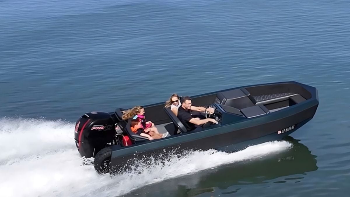 But the point of this design is that you don’t need to launch the boat from a trailer; you just unhook it from your truck or large car and drive it into the water. The price before options is $135K, and while that is a bit high for an 18-foot outboard boat, the advantage is that you can drive this one out of the water. To put this in perspective, a high-end outboard motorboat would typically cost below $50K.