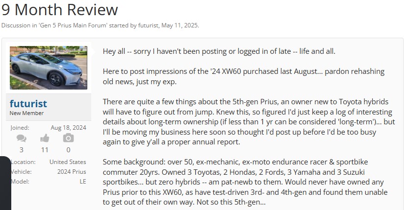 In a refreshingly candid forum post on PriusChat, one owner, “futurist,” a former endurance motorcycle racer and Civic Sport driver, lays it bare: