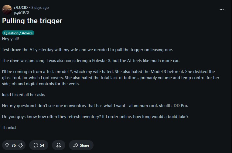One Reddit user, Any-Contract9065, who, like many, took to the Lucid subreddit to express why they’re interested in a Lucid Air.