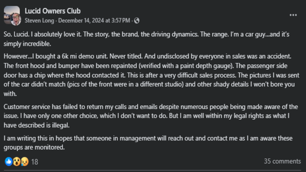 As the thread progressed, Long indicated that he had been put in touch with a contact at Lucid, offering hope for a potential resolution. However, the incident raises important questions about the trust and transparency that should exist between manufacturers, sellers and the buying public.