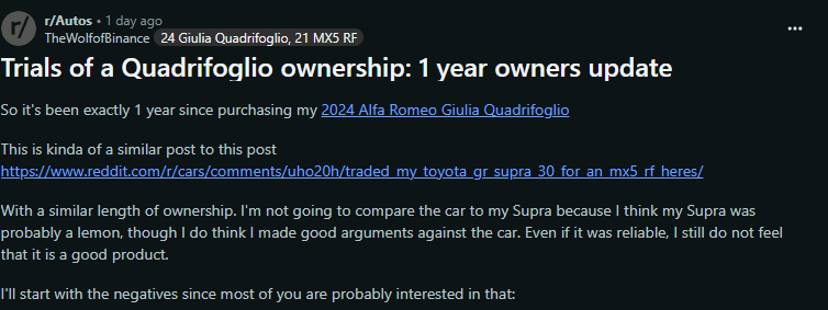 “So it's been exactly 1 year since purchasing my 2024 Alfa Romeo Giulia Quadrifoglio