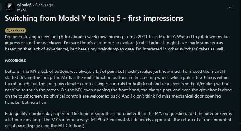 “I’ve been driving a new Ioniq 5 for about a week now, moving from a 2021 Tesla Model Y. I wanted to jot down my first impressions of the switchover. I’m sure there’s a lot more to explore (and I’ll admit I might have made some errors based on that lack of experience), but here’s my braindump to date. I'm interested in other switchers' takes as well.