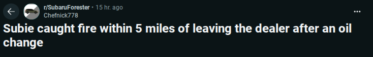 “Almost 3 months ago, I took my 2023 Subaru Forester Sport into the dealer for an oil change and to start an oil consumption test. Within 5 miles, I pulled over because of the smoke and I called the dealer. The car caught fire while on the phone and I had to call 911. Initial report said battery, but the final report said oil leaked from the filter and or drain plug onto the catalytic and caught fire. Dealer has been terrible to deal with. Subaru customer advocacy is still looking into our to it... sent reps out to take a look and haven't heard back almost 6 weeks later.. dealer offered 500$ off a new car. Has anyone had a similar experience with their oil changes? This was a Subaru dealer working on a Subaru car, I'd expect this from Walmart or jiffy live but not an authorized service center with factory trained techs.. Can't sue them in NY so I'm left hoping Subaru helps us out!”