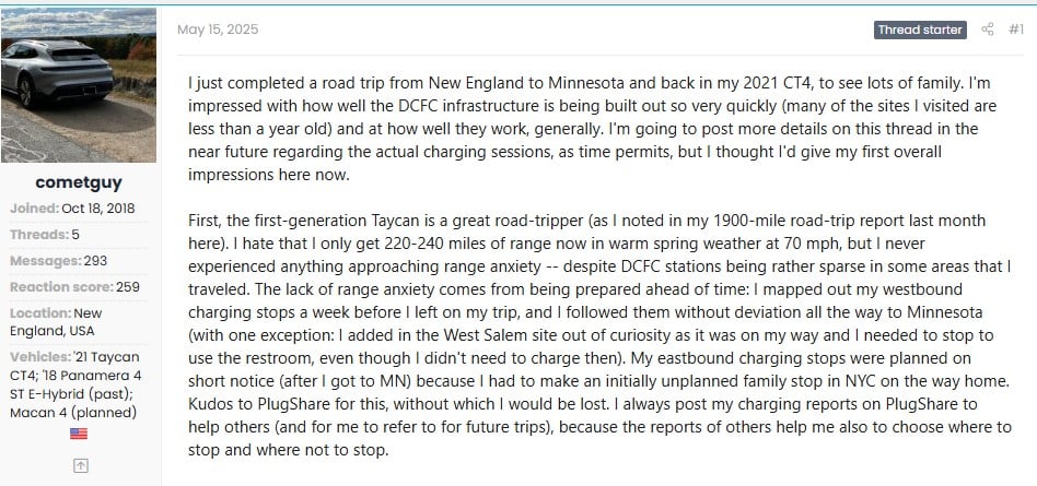But then there’s cometguy, a Porsche Taycan owner who quietly did something more impressive, he drove 3,000 miles through the heartland of America without drama, detours, or dread. His verdict? “I never experienced anything approaching range anxiety.”