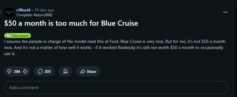 “I assume the people in charge of the model read this at Ford. Blue Cruise is very nice. But for me, it's not $50 a month nice. And it's not a matter of how well it works - if it worked flawlessly it's still not worth $50 a month to occasionally use it.”