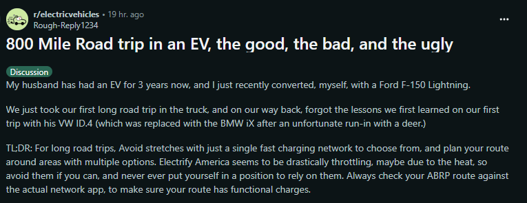 Now, let’s not pretend this is unique. Veteran EV drivers know the game. One Redditor, Captain_Aware4503, put it bluntly: “I always plan for the range to be 30–40% less and charge a little more than apps recommend. It adds a little time, but removes the stress.” Another, driving from Philadelphia to L.A. in an Audi e-tron, found that charging rates didn’t always match station specs; his 150kW-capable e-tron charged faster at 150kW EA units than it did at the 350kW ones. Temperature, battery state, and station health all play a role. And when any link in that chain is weak, it’s the driver who pays the toll.