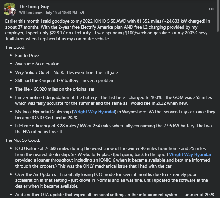 “Earlier this month, I said goodbye to my 2022 IONIQ 5 SE AWD with 81,352 miles (~24,833 kW charged) in about 37 months. With the 2-year free Electrify America plan AND free L2 charging provided by my employer, I spent only $228.17 on electricity - I was spending $100/week on gasoline for my 2003 Chevy Trailblazer when I replaced it as my commuter vehicle.