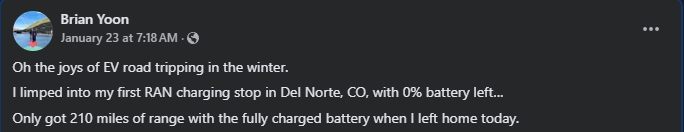 Oh the joys of EV road tripping in the winter," Yoon recounted sarcastically. "I limped into my first RAN charging stop in Del Norte, CO, with 0% battery left... Only got 210 miles of range with the fully charged battery when I left home today.