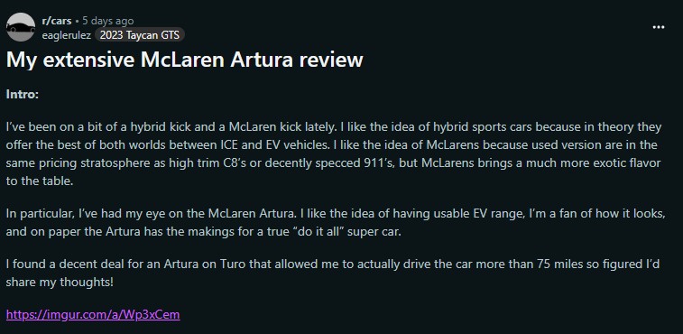 Redditor eaglerulez, an owner of a Porsche Taycan GTS and a seasoned test pilot of everything from C8 Z06s to Alfa 4Cs, lived with the Artura long enough to understand it and came away both impressed and slightly underwhelmed.