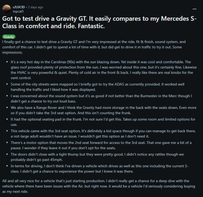 And there’s no better proof of that than the voice of a dyed-in-the-wool luxury buyer. One Mercedes S-Class owner took to Reddit’s r/Lucid community this week to offer a no-BS take after driving the Gravity GT: