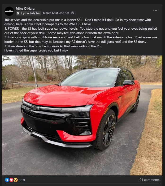 And it works. One Blazer EV RS owner summed it up perfectly in a Facebook post after being handed the SS trim as a loaner: