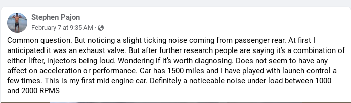 "Common question. But noticing a slight ticking noise coming from passenger rear. At first I anticipated it was an exhaust valve. But after further research people are saying it’s a combination of either lifter, injectors being loud. Wondering if it’s worth diagnosing. Does not seem to have any affect on acceleration or performance. Car has 1500 miles and I have played with launch control a few times. This is my first mid engine car. Definitely a noticeable noise under load between 1000 and 2000 RPMS"