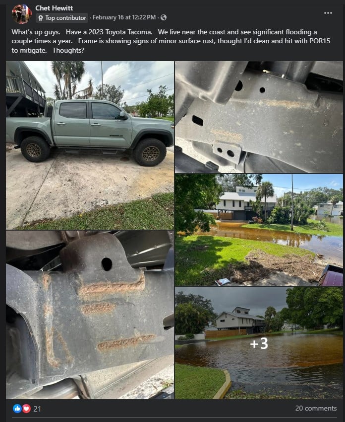"What’s up guys. Have a 2023 Toyota Tacoma. We live near the coast and see significant flooding a couple times a year. Frame is showing signs of minor surface rust, thought I’d clean and hit with POR15 to mitigate. Thoughts?"
