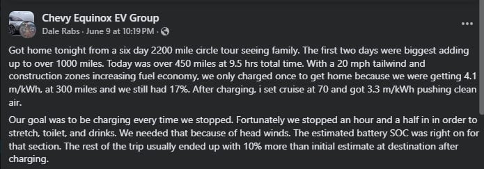 “Got home tonight from a six-day 2200-mile circle tour seeing family. The first two days were the biggest adding up to over 1000 miles. Today was over 450 miles at 9.5 hrs total time. With a 20 mph tailwind and construction zones increasing fuel economy, we only charged once to get home because we were getting 4.1 m/kWh, at 300 miles, and we still had 17%. After charging, I set the cruise at 70 and got 3.3 m/kWh pushing clean air.