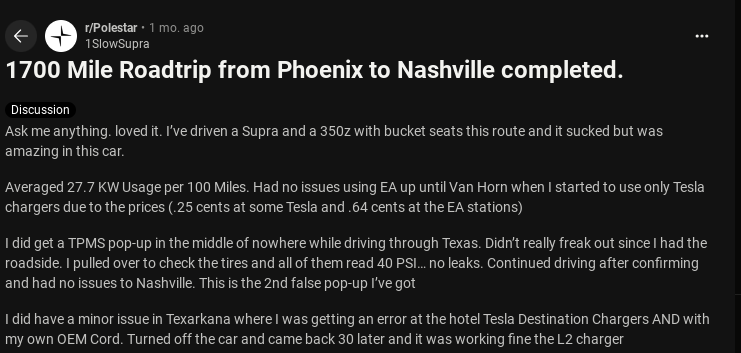 Another Reddit user, 1SlowSupra, had a 1,700-mile crusade from Phoenix to Nashville in his Polestar 2.