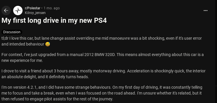 “I love this car, but lane change assist overriding me mid-maneuver was a bit shocking, even if it's user error and intended behaviour 😅.”