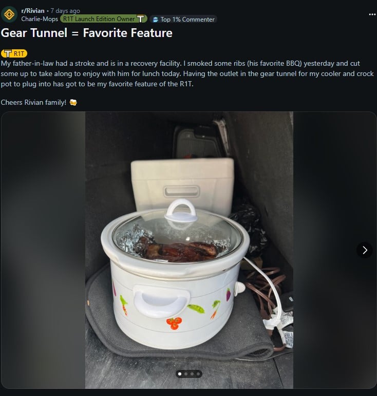 Take a recent post from the r/Rivian subreddit, titled simply: “Gear Tunnel = Favorite Feature.” The author, an R1T owner, didn’t post dyno numbers or hypermile data. Instead, they shared this: