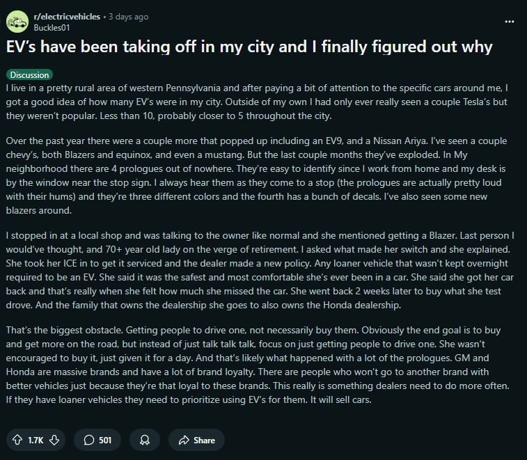 I stopped in at a local shop and was talking to the owner like normal, and she mentioned getting a Blazer. Last person I would’ve thought, and a 70+ year old lady on the verge of retirement. I asked what made her switch, and she explained. She took her ICE in to get it serviced, and the dealer made a new policy. Any loaner vehicle that wasn’t kept overnight was required to be an EV. She said it was the safest and most comfortable she’s ever been in a car. She said she got her car back, and that’s really when she felt how much she missed the car. She went back 2 weeks later to buy what she had driven. And the family that owns the dealership she goes to also owns the Honda dealership.