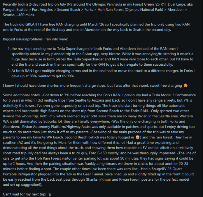Washington’s Olympic Peninsula, where nature is king and Subarus are its loyal subjects, one man steered his electric chariot, an R1T named Ranger, on a 460-mile, two-day loop from Seattle to the rainforests of Forks and back again. It wasn’t an expedition meant to make headlines or social media waves. Instead, it was something older and nobler: a family road trip, made possible by curiosity, range confidence, and a promotional perk that might be the most underappreciated benefit of early EV adoption, free charging on the Rivian Adventure Network through March 2026.