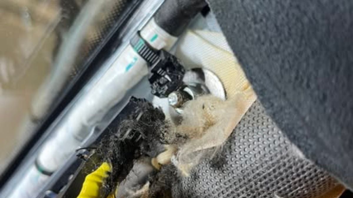 Somewhere along the way during my travels, I must’ve picked up a mouse. For over a month, I noticed a faint odor now and then, and occasionally found droppings, but despite searching thoroughly, I couldn’t find the source. Then, last week, I got a warning message about an electrical issue and was told to bring the truck to a Rivian Service Center immediately. They towed it in, props to them for being responsive, and while that particular issue turned out to be unrelated to the mouse, the technicians discovered a nest and significant droppings during the inspection.