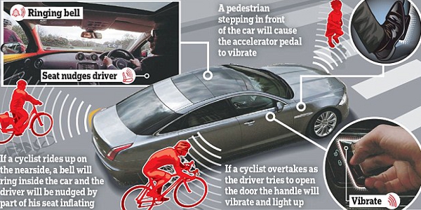 Jaguar spokesman said “Sensors on the car will detect when another road user is approaching and identify it as a bicycle or motorbike – it will then make the driver aware of the potential hazard before the driver sees it.” The coolest feature is when the system senses an oncoming cyclist from behind; the car seat will extend to “tap” the driver on the left or right side of their shoulder causing the driver to instinctively look over that shoulder to find the potential hazard.