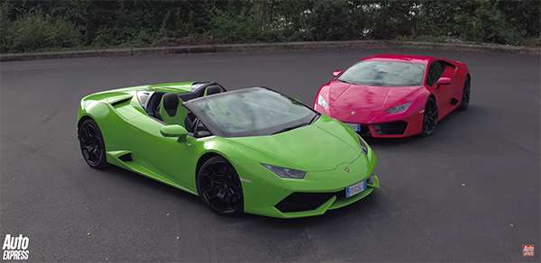 Auto Express decided to compare the two extremes of the Huracán lineup; the LP580-2 Coupe and LP610-4 Spyder. The LP580-2 Coupe sits as the Huracán's entry-level model, but it still features a 5.2L V10 engine with 572 horsepower and rear-wheel drive. The run to 60 mph takes only 3.4 seconds and can hit a top speed of 199 mph. The LP610-4 Spyder sits on the other end of the spectrum with 602 horsepower from the same V10 engine and all-wheel drive. The 0-60 time is the same as the coupe, 3.4 seconds.