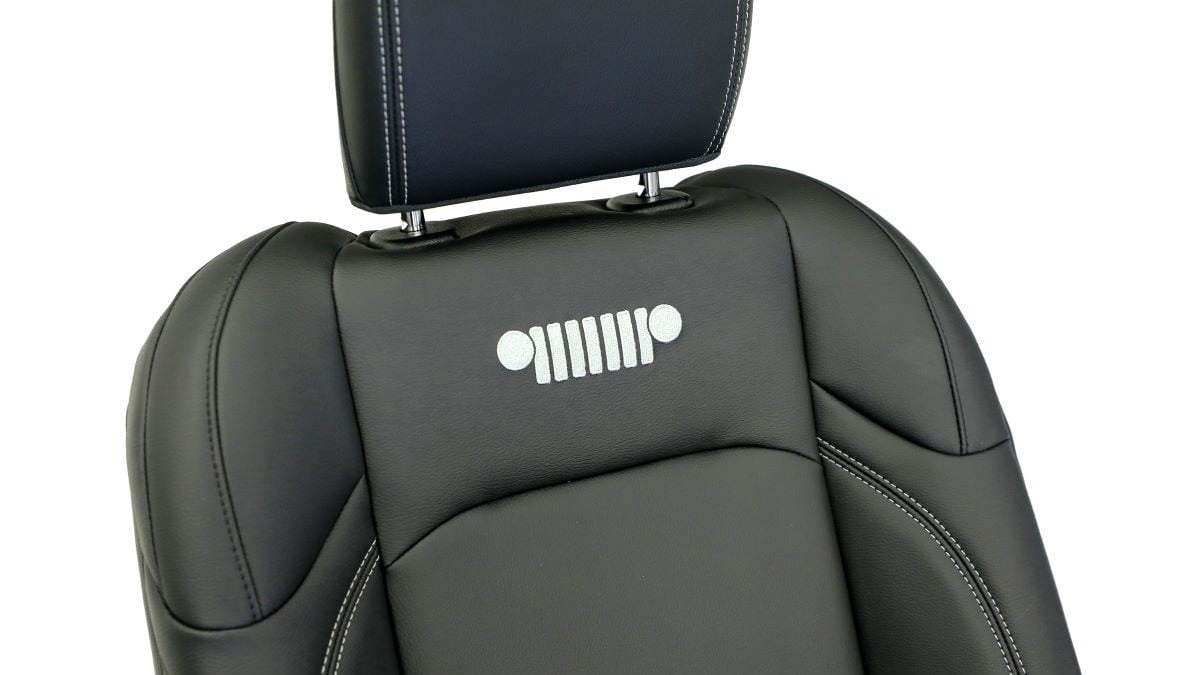 “JPP heavy-duty vinyl seats (Select code CBU when ordering - $1,695 factory-installed at the Mopar Custom Shop): Katzkin vinyl provides surface protection against the most extreme conditions, including water, mildew, scuffs, tears, fading and even the most unpredictable elements, such as kid spills. Available in black with an embroidered Jeep Wrangler grille and stitching in Light Tungsten.”