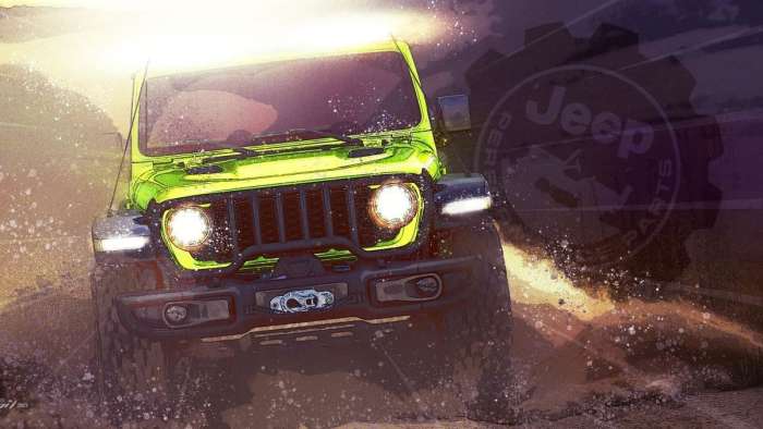 The neon-pink sketch shows a vehicle that is clearly a Rubicon 4xe. The blue outlines on the lettering signal the 4xe. However, Jeep doesn’t show enough of the vehicle to know if it is a 2023 Wrangler or possibly even a Gladiator. A Gladiator 4xe isn’t on the market yet, but the Easter Jeep Safari is all about Jeep concepts, so this could be one of the highlights.