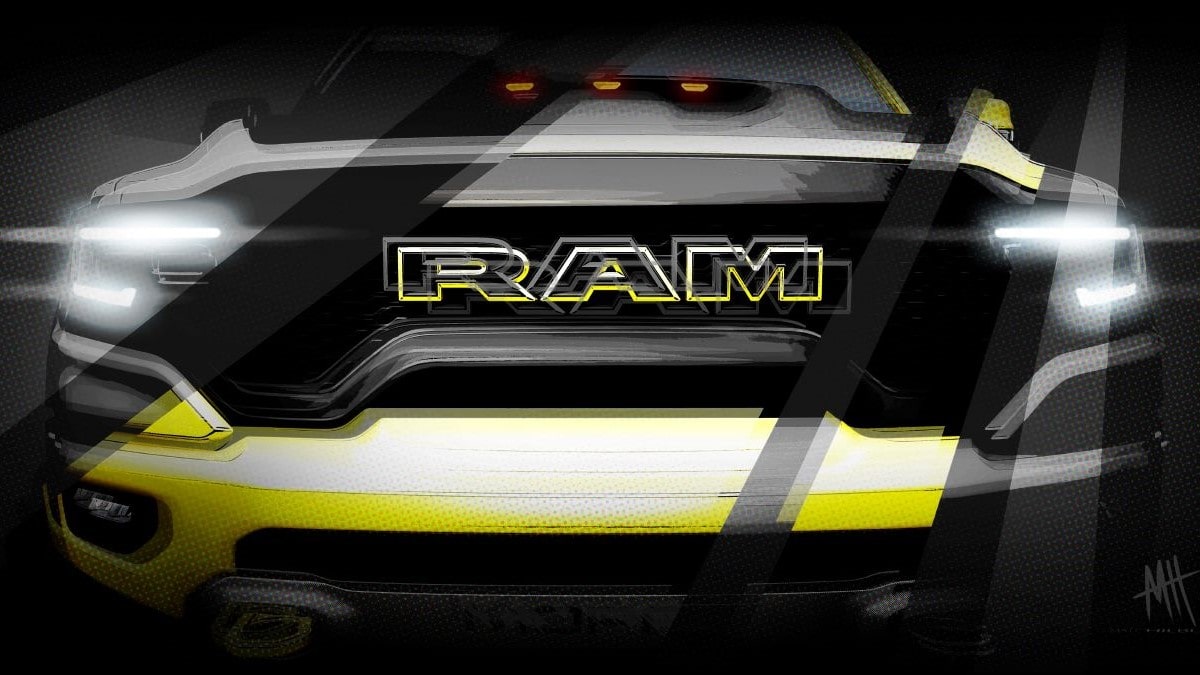 Ram is typically one of the most important vehicles for Mopar at the SEMA show. Mopar has created all sorts of concepts in the past, upgrading the popular Ram trucks. Many of Mopar combinations end up being offered as packages straight from the factory. The first sketch shows a boldly colored Ram truck, which appears to be white with bright yellow and black trim. The concept has what appears to be a major hood scoop and three orange lights. Mopar did not offer any explanations.