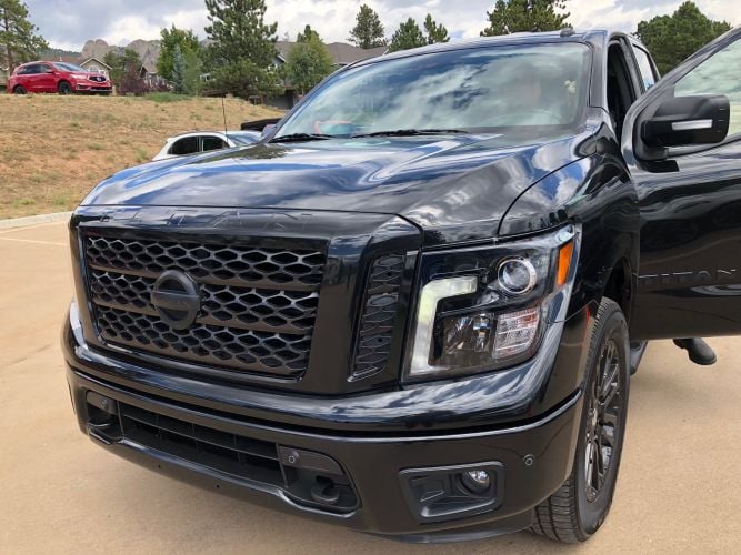 The huge Nissan Titan showed why it was selected as the Rocky Mountain Truck of the Year! The Midnight edition is a striking addition to the Titan line up. The Midnight Edition includes body color grille with dark insert, dark headlamps, black fog lamp finisher, black exterior badging, black mirrors, black door handles, 20-inch black wheels, body color front and rear bumpers, black step rails, dark charcoal interior trim and special badging.