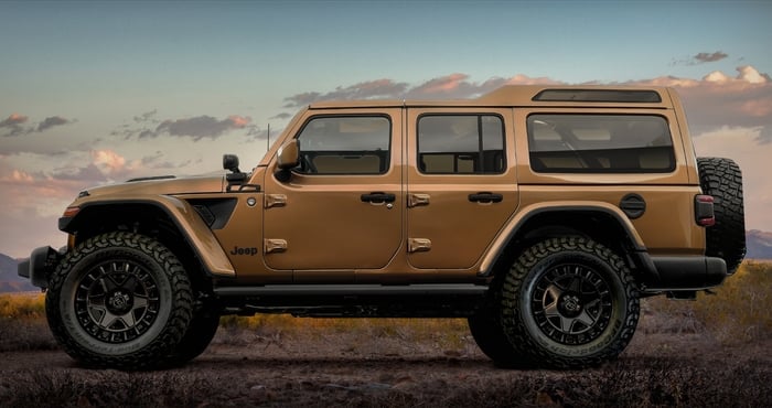 The Jeep Wrangler Magneto 2.0 is an update of sorts to last year’s battery-electric Jeep Wrangler Magneto. The new version has jaw-dropping 625 horsepower for serious rock-climbing. It can instantly deliver up to 850 lb.-ft. of peak torque to the wheels. That is more than triple the torque output of last year’s concept. The Magneto 2.0’s powertrain includes a custom-built axial flux electric motor that operates up to 5,250 rpm. It has a six-speed manual transmission for ultimate control over acceleration.