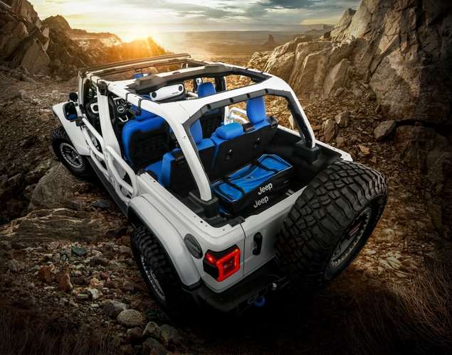 This concept is sure to draw a lot of attention because it marries the Jeep Gladiator with the capability of the Jeep Wrangler. The Jeep Bob concept is Jeep’s take on the popular trend of “bobbing” the long overhangs of pickup truck beds. The Bob is based on a Jeep Gladiator Rubicon, but all four doors and B-pillars have been removed for the ultimate open-air freedom. Additionally, a customized hardtop has been perforated and a canvas top has been stretched over top to provide shelter from the elements while allowing natural light through.