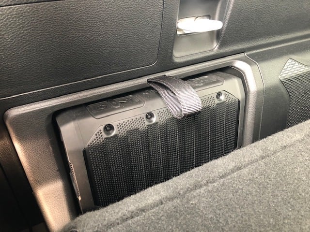 Another fun feature that outdoor lovers will enjoy is a special portable blue-tooth speaker built into the back. The portable speaker sits behind the rear seat in its own charging station. When it is docked in the charging station, it acts as a tenth integrated speaker. However, the speaker can easily be pulled out and used outside the truck. It pairs with your smartphone and can provide music out at the campfire or on the beach. You can even get it wet, within reason. Rechargeable and portable, you will wonder how you lived without it, especially when you stop for that impromptu picnic or beach party. Jeep also built in extra hidden, locking, storage under the back seats, so that you can go out surfing or hiking and not have to take all your valuables with you!
