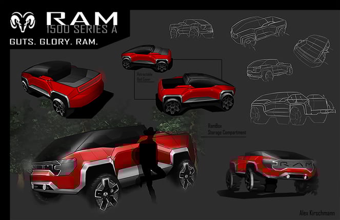 Alex David Kirschmann takes home third place for his futuristic drawing of a Ram 1500 Series A truck. Kirschmann envisions a truck with more RamBox storage as well as a retractable truck bed cover. Kirschmann is in the 11th grade, in Auburn Hills, Michigan. Auburn Hills is where the massive Fiat Chrysler headquarters is located.