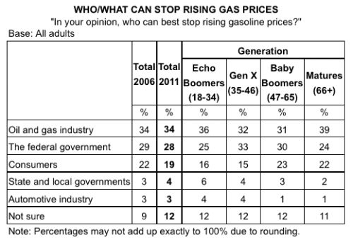One-third of those polled (34%) think only the oil and gas industry can solve the problem. The federal government must do something in the eyes of 28 percent while 19 percent believe consumers have the power to stop rising prices.