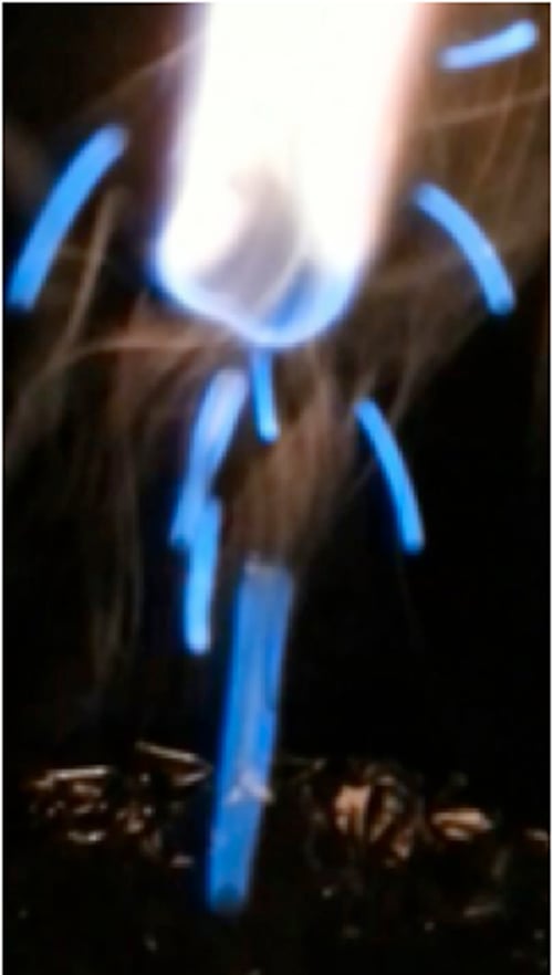 These light blue sparks come from the HydroBlaze, an organic water-based hydrogen fuel invented by the two brothers. The wick is coated with the fuel and then dipped into normal wax. When lit, the hydrogen containing fuel combusts forming cyan-blue sparks of hydrogen energy.