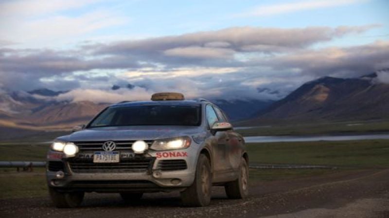 Rainer Zietlow and his teammates drove their 2011 Volkswagen Touareg TDI through this course in 11 days, 17 hours and 22 minutes, traveling from Texas to Alaska in just two days in the recently ambient blazing heat! Remarkably they drove non-stop an actual 16,000 miles, sleeping in the car when possible, across two continents on a single set of tires.